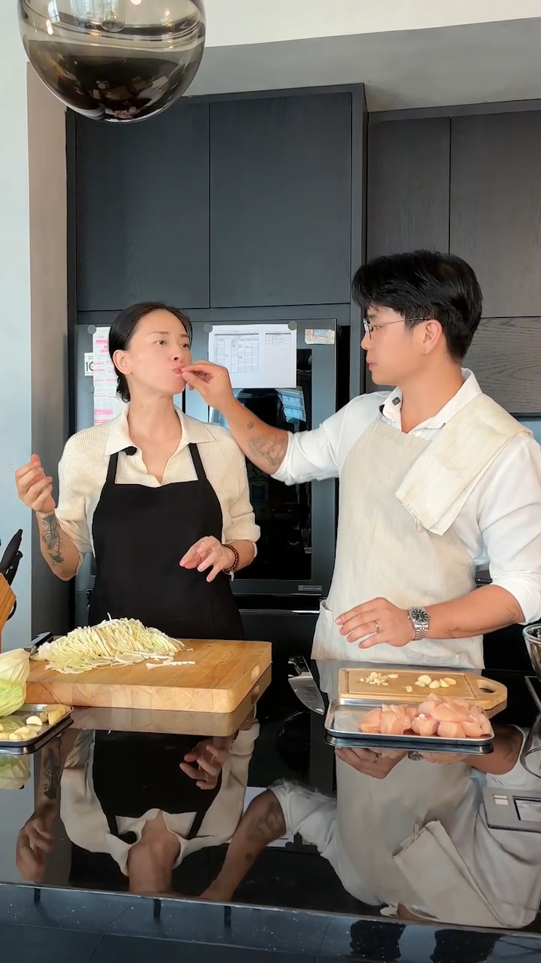 Khi Ngô Thanh Vân bày tỏ mong muốn được ăn món Hàn Quốc, Huy Trần liền nhanh chóng "gật đầu cái rụp" và xắn tay vào bếp. Anh chia sẻ: "Hôm nay là ngày chủ nhật, hai vợ chồng được nghỉ ở nhà. Công việc mà 2 đứ rất thích làm cùng nhau đó là nấu ăn".