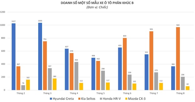 Suốt từ đầu năm 2023, cuộc rượt đuổi giữa các đối thủ trong phân khúc B-SUV diễn ra gay cấn. Kết thúc quý I, Hyundai Creta chiếm ngôi đầu phân khúc B-SUV, doanh số tổng đạt 2.647 xe, trong khi đối thủ bám đuổi Kia Seltos bán được 1.481 chiếc, mức chênh lệch đến gần 80%.