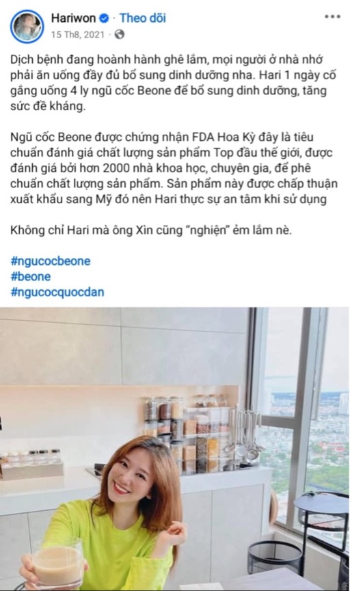 Facebook ca sĩ HariWon cũng có bài đăng liên quan đến “chuẩn FDA” của ngũ cốc Beone.