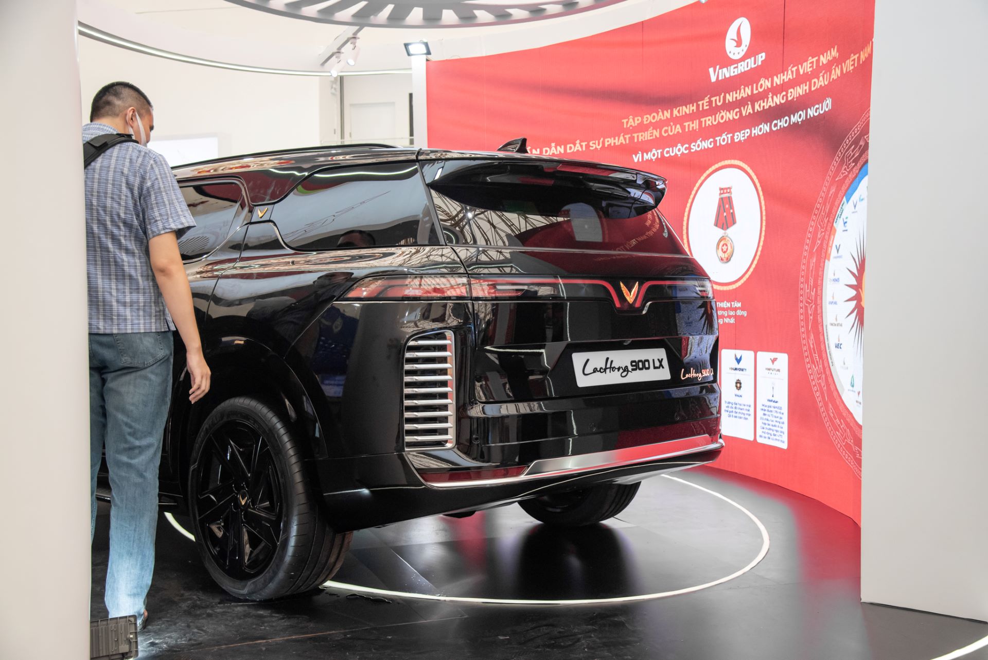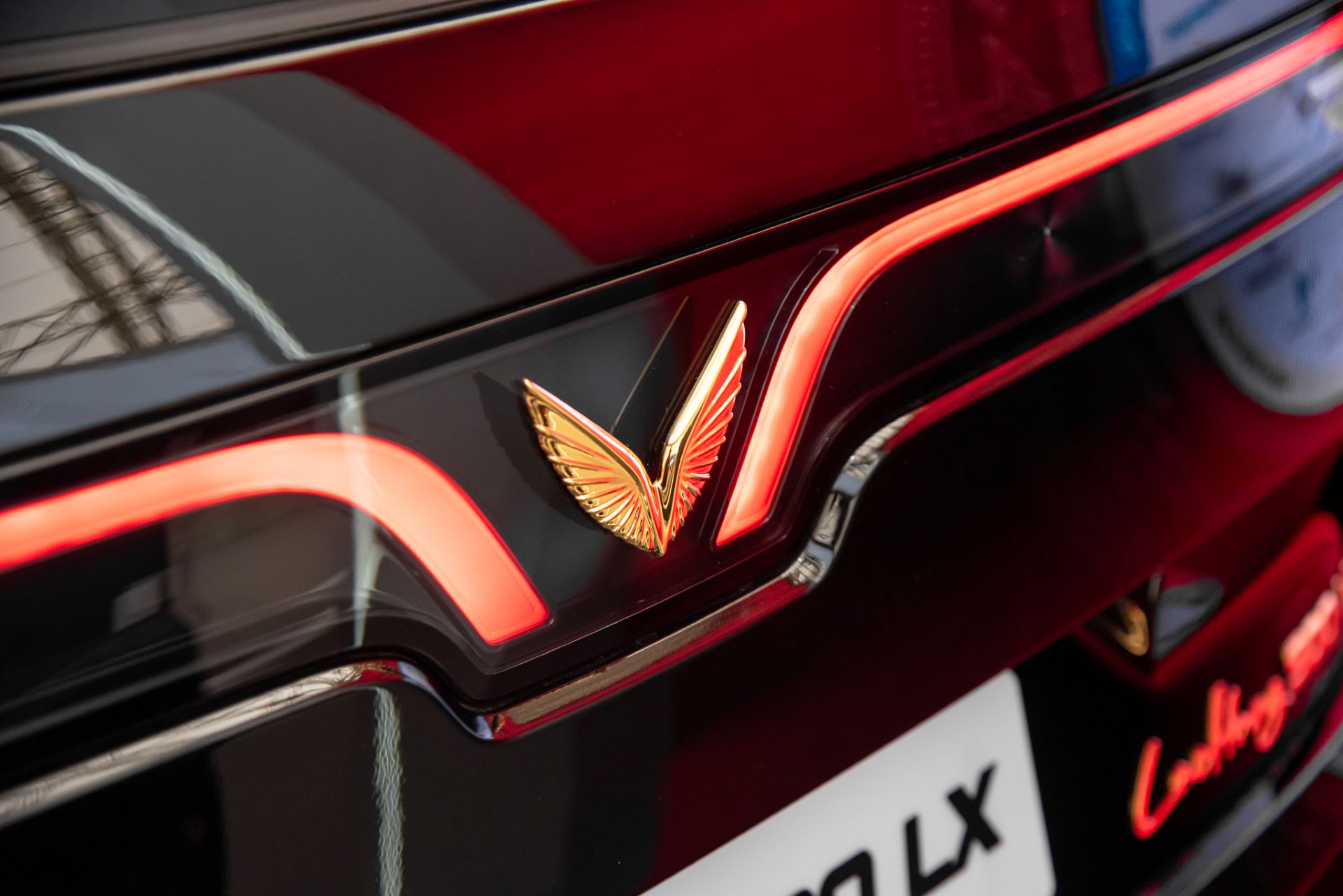 Tay nắm cửa dạng ẩn, chi tiết từng gây ấn tượng trên VF 9, nay được mạ vàng, tạo nên sự sang trọng khác biệt. Ở phía sau, dải LED hình cánh chim đặc trưng tiếp tục xuất hiện, nhưng đi cùng logo Lạc Hồng và bộ tem “Lac Hong 900 LX” mạ vàng.