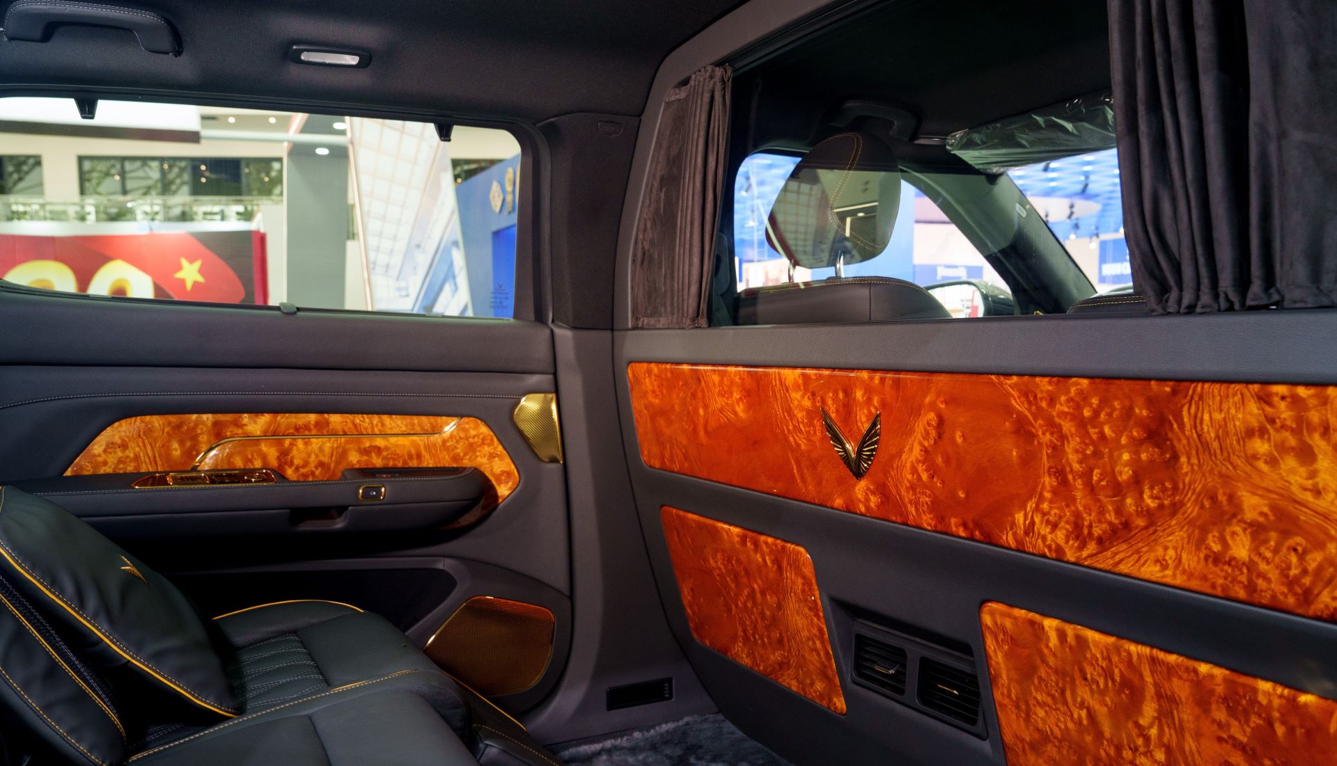Đặc biệt, gỗ Golden Nanmu (Nam Mộc Hoàng Kim) - loại gỗ cực kỳ quý hiếm gắn liền với hoàng gia châu Á được sử dụng để ốp bệ trung tâm và cửa sau. Những đường chỉ vàng thêu nổi bật trên ghế da cao cấp, cùng logo Lạc Hồng ở tựa đầu, hoàn thiện không gian đẳng cấp chỉ dành cho giới tinh hoa.
