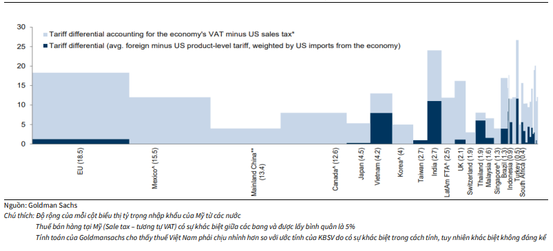 Cụ thể, Việt Nam đang đánh thuế nhập khẩu trung bình cao hơn 5.8% mức thuế nhập khẩu mà Mỹ đang áp dụng và nếu tính thêm VAT thì con số này lên đến gần 11%. Theo tính toán của KBSV Research dựa trên phương pháp bình quân gia quyền với trọng số theo tỷ trọng trong rổ hàng hóa Việt Nam nhập khẩu vào Mỹ, thuế nhập khẩu trung bình của Việt Nam là 9.3%. Trong khi, thuế nhập khẩu trung bình của Mỹ là 3.5%.