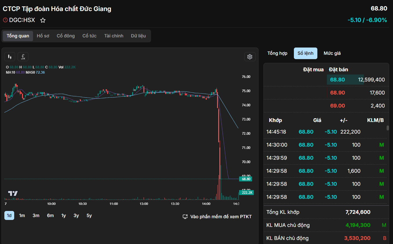 Kết phiên, DGC giảm kịch biên độ xuống 68.800 đồng/cổ phiếu, trong tình trạng “trắng bên mua”, với lượng dư bán lên tới hàng chục triệu đơn vị. Thanh khoản tăng vọt cho thấy tâm lý hoảng loạn lan rộng trong giới đầu tư.