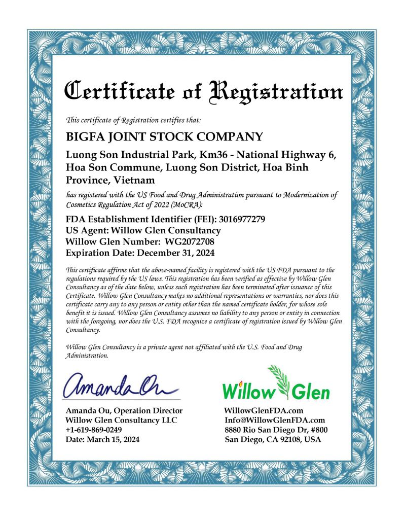 Theo quy định của Cục Quản lý Thực phẩm và Dược phẩm Hoa Kỳ (FDA), cơ quan này không cấp bất kỳ loại giấy chứng nhận chất lượng hoặc phê duyệt nào cho mỹ phẩm, thực phẩm hoặc thực phẩm chức năng trước khi lưu hành. Việc doanh nghiệp đăng ký cơ sở sản xuất với FDA chỉ là thủ tục hành chính nhằm mục đích quản lý, truy xuất và giám sát khi cần thiết, không đồng nghĩa với việc sản phẩm đã được FDA kiểm định, công nhận hay phê duyệt.
