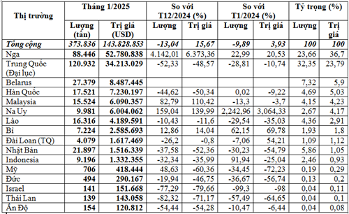 Nhìn chung, trong tháng 1/2025, nhập khẩu phân bón từ phần lớn các thị trường đều tăng so với tháng 1/2024. Mặc dù lượng nhập khẩu giảm, giá trị kim ngạch tăng phản ánh sự thay đổi trong nguồn cung và xu hướng giá phân bón quốc tế.