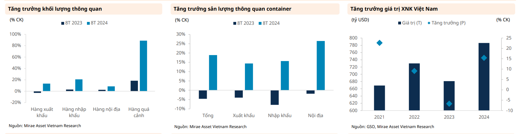 Theo Báo cáo ngành mới đây của Công ty Chứng khoán Mirae Asset Việt Nam (MASVN), Kim ngạch xuất nhập khẩu duy trì đà tăng trưởng tốt trong năm 2024, đạt 786.3 tỷ USD (tăng 15.4% so với cùng kỳ năm trước). Trong đó, giá trị xuất khẩu và nhập khẩu đạt lần lượt 380.7 tỷ USD (tăng 16.8%) và 405.5 tỷ USD (tăng 14.3%).