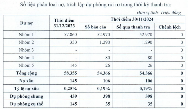 Kết luận thanh tra cho thấy tại thời điểm 30/11/2024, nợ xấu của đơn vị là 106 triệu đồng, chiếm tỷ lệ 0,19% tổng dư nợ. Nguyên nhân phát sinh nợ xấu là do tình hình sản xuất kinh doanh của thành viên gặp khó khăn, làm ăn thua lỗ dẫn đến bị mất vốn. Qua thanh tra không phát sinh các trường hợp phải chuyển nhóm nợ và trích lập dự phòng rủi ro bổ sung.