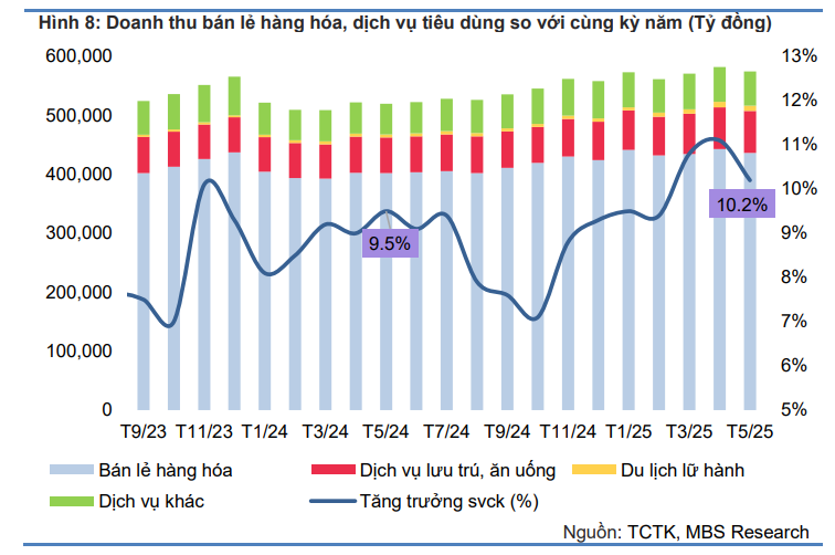Tiêu dùng nội địa tiếp tục ghi nhận mức tăng trưởng hai chữ số tháng thứ ba liên tiếp trong tháng 5, song song với đà tăng trưởng ổn định của lượng khách quốc tế đến Việt Nam. Cụ thể, tổng mức bán lẻ hàng hóa và doanh thu dịch vụ tiêu dùng tháng 5 tăng 0.4% so với tháng trước và tăng 10.2% svck – thấp hơn một chút so với mức đỉnh trong gần hai năm tại 11.1% được ghi nhận trong tháng 4. Trong 5 tháng đầu năm 2025, tổng mức bán lẻ hàng hóa và doanh thu dịch vụ tiêu dùng tăng 9.7% svck, nếu loại trừ yếu tố giá tăng 7.4% svck – cao hơn mức tăng 4.5% của cùng kỳ năm ngoái.