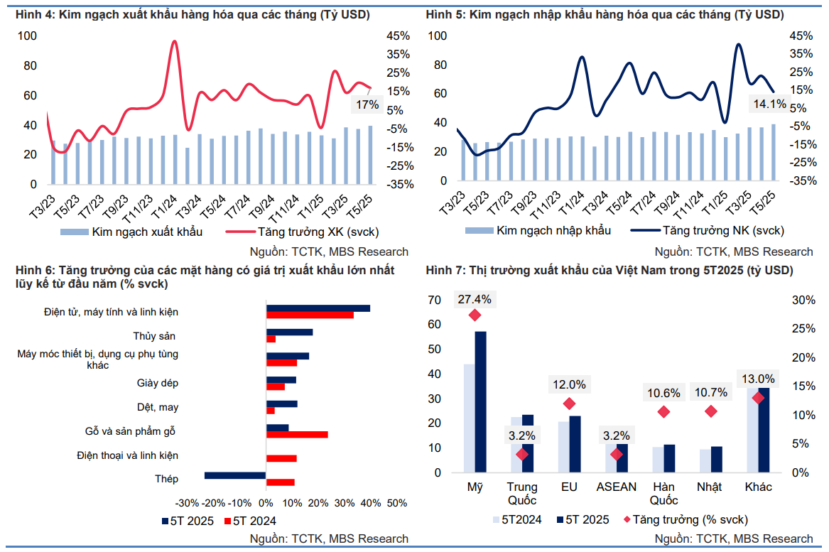 Lũy kế 5 tháng đầu năm 2025, kim ngạch xuất khẩu đạt 180.23 tỷ USD (+14% svck), với nhiều mặt hàng có mức tăng trưởng cao như: Đồ chơi, dụng cụ thể thao và bộ phận (+91.8% svck); điện tử, máy tính và linh kiện (+39.7% svck); sản phẩm từ sắt thép (+31% svck). Ở chiều ngược lại, một số mặt hàng ghi nhận mức tăng trưởng âm lớn như: sắt thép (-23.5% svck); máy ảnh, máy quay phim và linh kiện (-18.9% svck); chất dẻo nguyên liệu (- 14% svck). Về thị trường xuất khẩu, Hoa Kỳ là thị trường lớn nhất của Việt Nam với kim ngạch ước đạt 57.2 tỷ USD (+27.4% svck). Xuất khẩu sang EU tăng 12% svck, đạt 23 tỷ USD, trong khi kim ngạch xuất khẩu sang Trung Quốc đạt 23.5 tỷ USD (+3.2% svck).