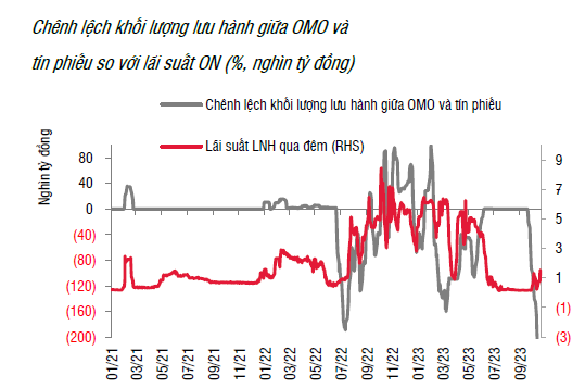 Trong tuần này sẽ ghi nhận thêm 73,8 nghìn tỷ đồng tín phiếu đáo hạn. Khối lượng trúng thầu giảm trên kênh tín phiếu nghiêng nhiều về khả năng nhu cầu yếu dần từ các NHTM cho kỳ hạn 28 ngày nhằm chuẩn bị cho nguồn vốn vào cuối năm hơn là đến từ việc thanh khoản hệ thống căng thẳng khi tín dụng chưa có sự phục hồi (tăng trưởng tín dụng tính đến 11/10 đạt 6,2% so với cuối năm 2022 - giảm từ mức 6,9% vào cuối tháng 9) và thấp hơn nhiều so với năm 2022 (11,2%).