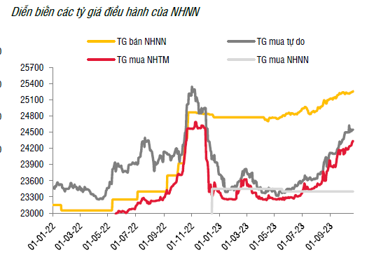 Trạng thái ngoại tệ trên hệ thông không quá bất lợi, và tỷ giá bán trên Sở GD NHNN đang được niêm yết ở VND 25,244 – cho thấy NHNN sẽ chưa tìm đến kênh dự trữ ngoại hối để ổn định thị trường. Tỷ giá USD/VND hiện tăng 3,8% so với cuối năm 2022 – nằm mức biến động cho phép và thông điệp từ NHNN đưa ra là sẽ điều hành tỷ giá một cách ổn định nhưng không đồng nghĩa với việc không có biến động.