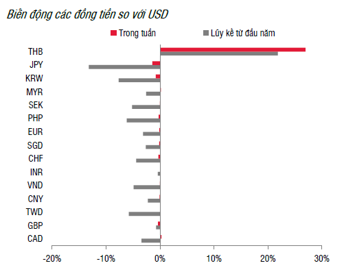 Trong tuần trước, thanh khoản hệ thống ở trạng thái ổn định và NHNN duy trì trạng thái rút ròng trên kênh thị trường mở, với tổng giá trị đạt 33,1 nghìn tỷ đồng. Cụ thể, xu hướng hút bớt thanh khoản xuyên suốt với việc đẩy mạnh phát hành tín phiếu (30,7 nghìn tỷ) trong khi có một lượng hợp đồng mua kỳ hạn đáo hạn (5,1 nghìn tỷ).