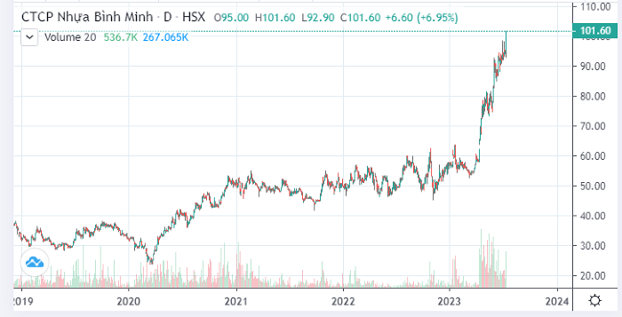 Kết thúc phiên giao dịch ngày 19/7, cổ phiếu BMP của Nhựa Bình Minh tăng kịch trần lên mức 101.600 đồng/cp. Thị giá của BMP đã bật tăng mạnh trong khoản thời gian gần đây sau thời gian dài đi ngang.