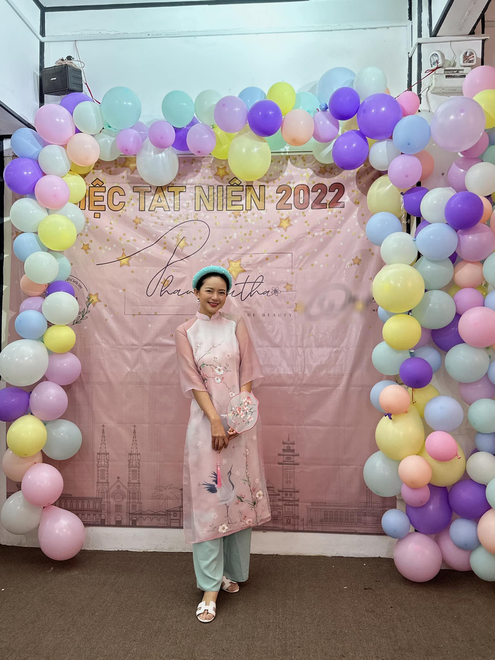 Phan Như Thảo khoe sắc vóc chẳng khác gì thời son rỗi khi diện áo dài hồng ở tiệc tất niên.