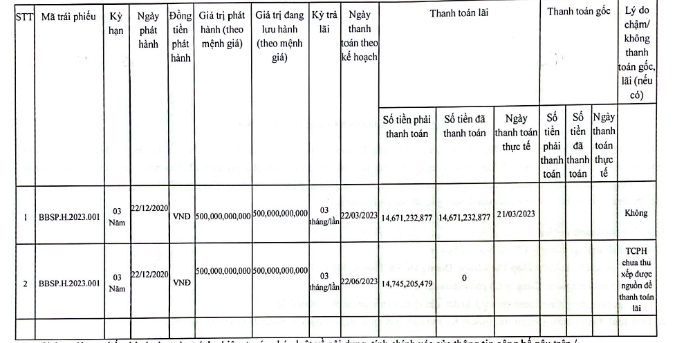 Nửa đầu năm, BB Sunrise Power vẫn thanh toán được khoản lãi trái phiếu cho kỳ ngày 22/3/2023 hơn 14,6 tỷ đồng. Tuy nhiên, đến hạn thanh toán ngày 22/06/2023, BB Sunrise Power báo cáo chưa thu xếp được nguồn tiền để thanh toán số tiền lãi hơn 14,7 tỷ đồng.