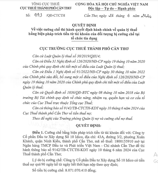 Cục Thuế thành phố Cần Thơ vừa ban hành quyết định về việc cưỡng chế thi hành quyết định hành chính về quản lý thuế bằng biện pháp trích tiền từ tài khoản đối với Công ty CP Đầu tư Xây dựng số 10 Idico.