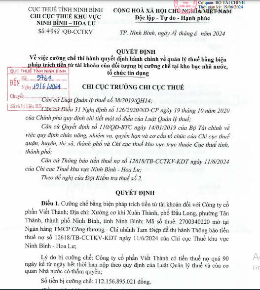Chi cục Thuế khu vực Ninh Bình – Hoa Lư vừa ban hành quyết định về việc cưỡng chế thi hành quyết định hành chính về quản lý thuế bằng biện pháp trích tiền từ tài khoản đối với Công ty Cổ phần Viết Thành.