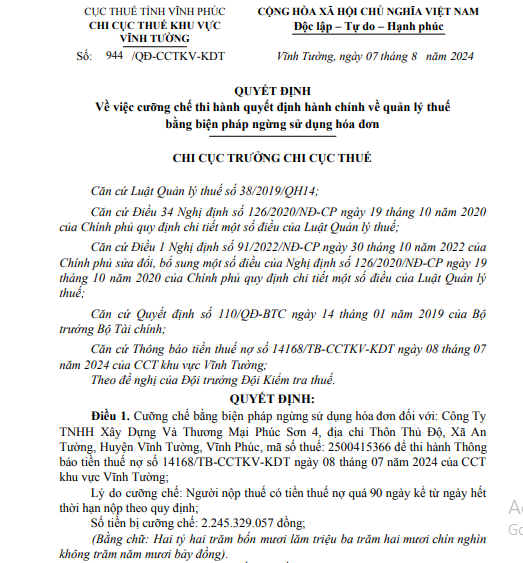 Thông tin từ Cục Thuế tỉnh Vĩnh Phúc cho biết, Chi cục trưởng Chi cục Thuế khu vực Vĩnh Tường Nguyễn Văn Mùi đã ban hành Quyết định số 944/QĐ-CCTKV-KDT, ngày 7/8/2024 về việc cưỡng chế thi hành quyết định hành chính về quản lý thuế bằng biện pháp ngừng sử dụng hóa đơn đối với Công ty TNHH Xây dựng và Thương mại Phúc Sơn 4 do nợ thuế.