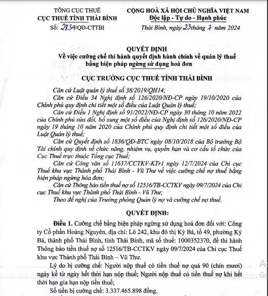 Theo Cục thuế tỉnh Thái Bình, đơn vị vừa ban hành Quyết định số 2854/QĐ-CCTKV, ngày 23/7/2024 về việc cưỡng chế thi hành quyết định hành chính về quản lý thuế bằng biện pháp ngừng sử dụng hóa đơn đối với Công ty Cổ phần Hoàng Nguyên do nợ thuế.