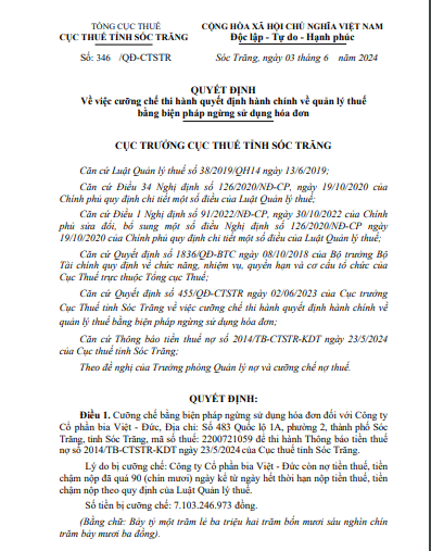 Cụ thể, Cục Thuế tỉnh Sóc Trăng đã có quyết định cưỡng chế bằng biện pháp ngừng sử dụng hóa đơn đối với Công ty Cổ phần bia Việt - Đức, Địa chỉ: Số 483 Quốc lộ 1A, phường 2, thành phố Sóc Trăng, tỉnh Sóc Trăng để thi hành Thông báo tiền thuế nợ số 2014/TB-CTSTR-KDT ngày 23/5/2024 của Cục thuế tỉnh Sóc Trăng.
