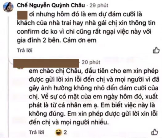 Trước lời thắc mắc của Quỳnh Châu, phía thanh niên tên Đ. sau đó đã gửi lời xin lỗi vì gây ảnh hưởng đến đám cưới. Người này thừa nhận việc làm của mình là sai trái và hành động này là "có mục đích riêng". Hiện phía Đ., cũng đã khóa tài khoản mạng xã hội để tránh bão dư luận.