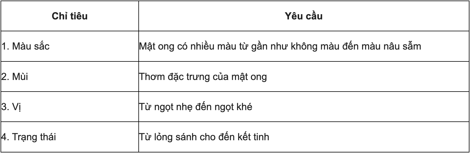 Về yêu cầu cảm quan, mật ong có 4 chỉ tiêu gồm: