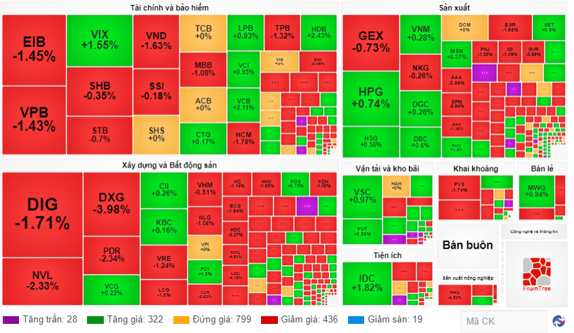 VN30 hôm nay có đến 19/30 mã giảm điểm. Nổi bật là PDR (-2.34%) và NVL (-2.33%) khi đây là hai cổ phiếu có mức giảm lớn nhất trong nhóm. Bên cạnh đó còn có một vài cái tên đáng chú ý khác như POW (-1.48%), VPB (-1.43%) hay TPB (-1.32%). Ở chiều hướng ngược lại, HDB (+2.43%) và VCB (+2.11%) là hai cổ phiếu duy nhất có mức tăng đáng kể trong phiên hôm nay.