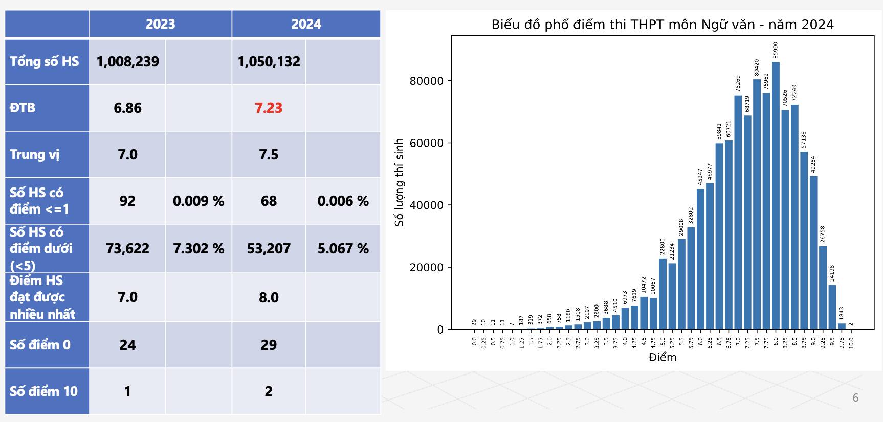 Môn ngữ văn có điểm trung bình là 7,23 điểm (năm 2023 là 6,86 điểm). Điểm thí sinh đạt được nhiều nhất là 8,0 (năm 2023 là 7,0).