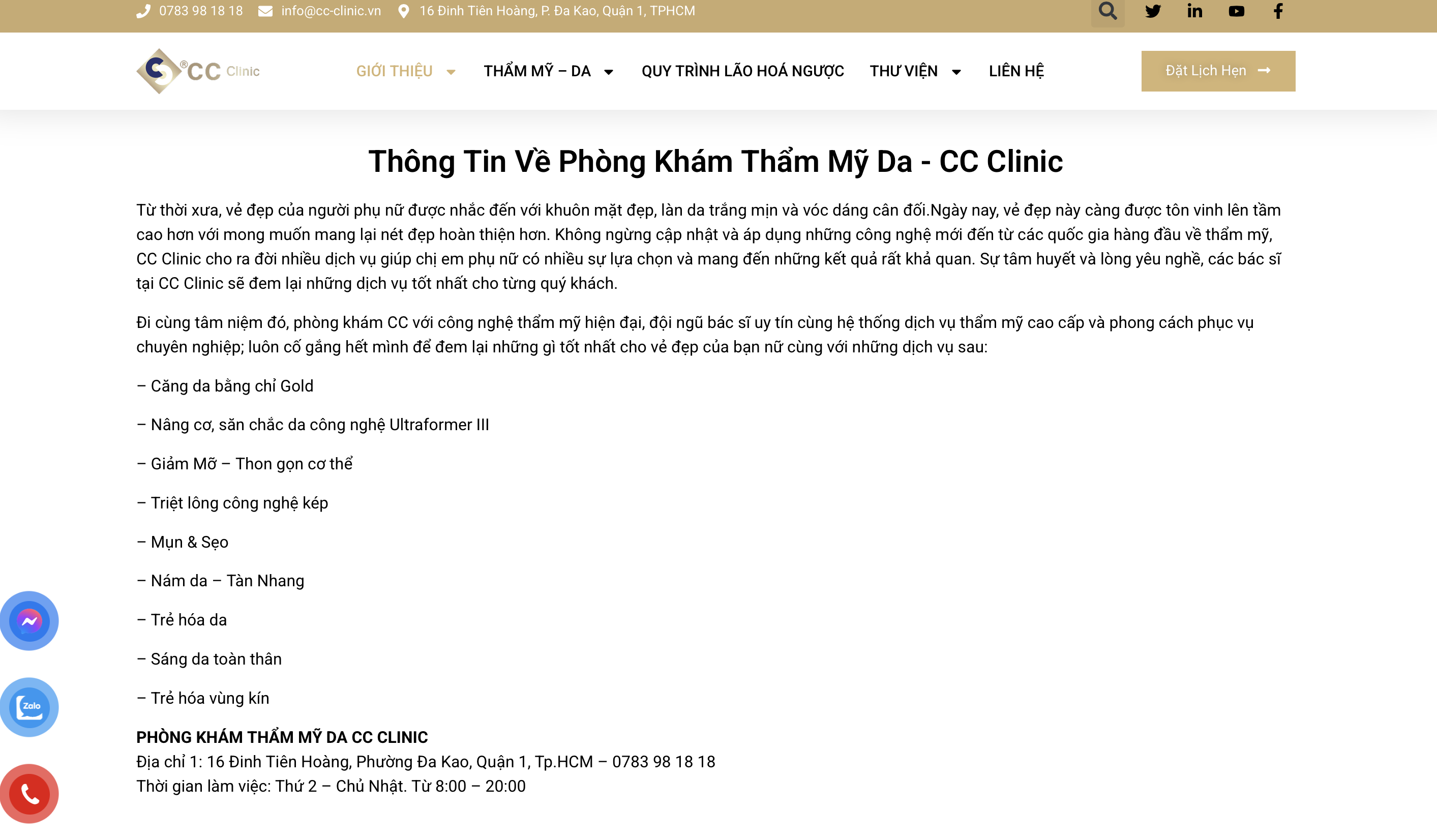 Tại website https://cc-clinic.vn quảng cáo phòng khám CC với công nghệ thẩm mỹ hiện đại, đội ngũ bác sĩ uy tín cùng hệ thống dịch vụ thẩm mỹ cao cấp và phong cách phục vụ chuyên nghiệp; luôn cố gắng hết mình để đem lại những gì tốt nhất cho vẻ đẹp của bạn nữ cùng với những dịch vụ sau: Căng da bằng chỉ Gold; Nâng cơ, săn chắc da công nghệ Ultraformer III; Giảm Mỡ – Thon gọn cơ thể; Triệt lông công nghệ kép; Mụn & Sẹo; Nám da – Tàn Nhang; Trẻ hóa da; Sáng da toàn thân; Trẻ hóa vùng kín.