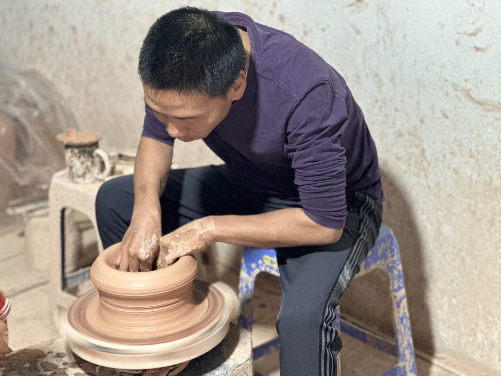 Nghệ nhân Bùi Thanh Tùng bên chiếc bàn xoay truyền thống.