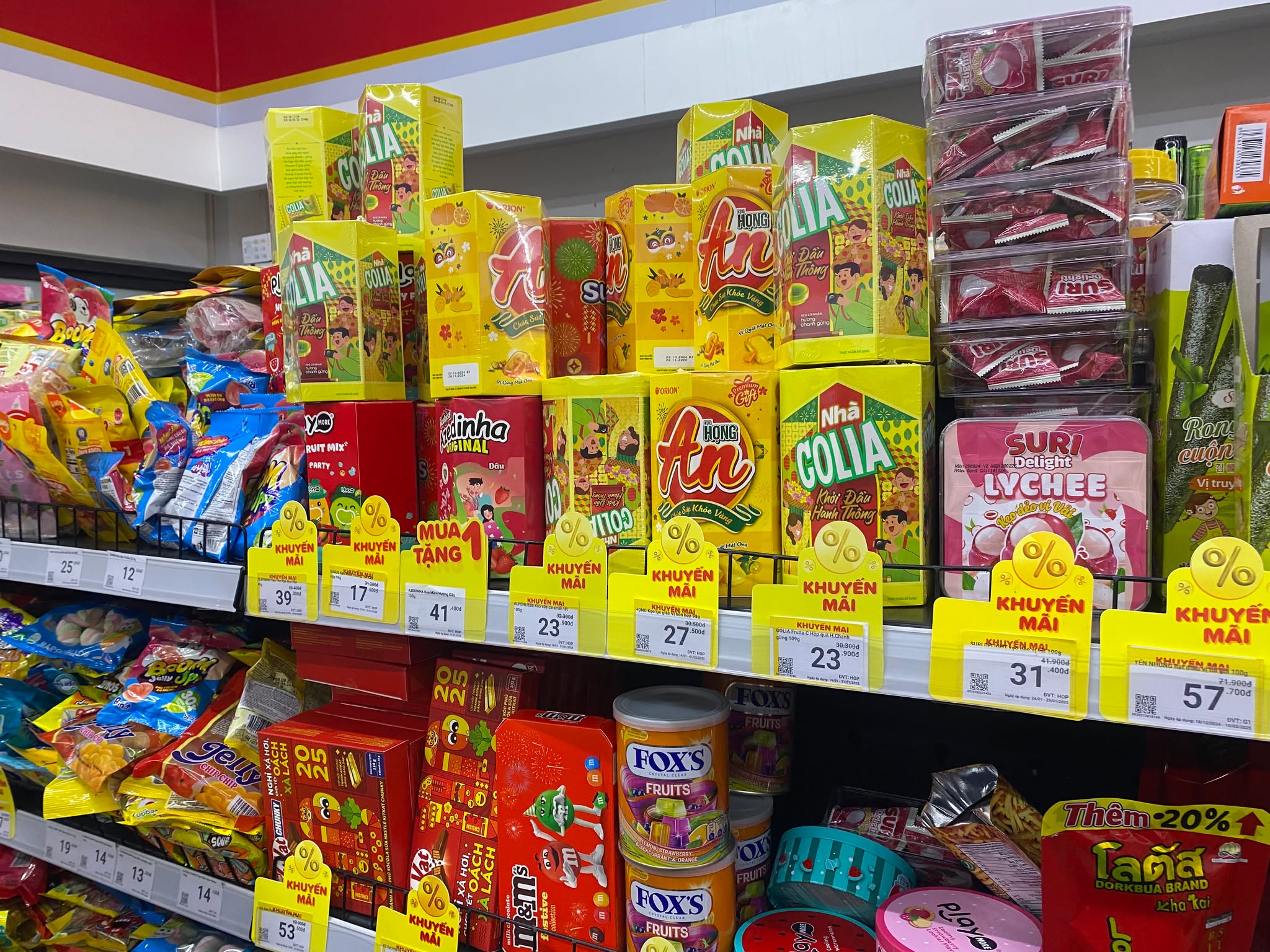 Tại các hệ thống siêu thị như Go!, Winmart+ và Co.opmart, các kệ hàng đã được lấp đầy bởi những sản phẩm mang đậm sắc Tết với bao bì và mẫu mã rực rỡ. Những ngày cận Tết, sức mua tăng mạnh so với ngày thường, đặc biệt là các mặt hàng như bánh kẹo, thực phẩm, đồ uống, quần áo và giày dép, trong đó nhiều mặt hàng ghi nhận mức tiêu thụ gấp đôi so với bình thường. Dù nhu cầu tiêu dùng tăng cao, giá cả hàng hóa vẫn được giữ ổn định nhờ sự chuẩn bị kỹ lưỡng về nguồn cung, các chương trình khuyến mãi hấp dẫn và việc đa dạng hóa kênh bán hàng, đặc biệt là các nền tảng trực tuyến, giúp đáp ứng tốt nhu cầu của người dân. Cụ thể, tại Winmart+ Quang Trung, nhiều mặt hàng bánh kẹo, gia vị và hoa quả được áp dụng chương trình “Khuyến mãi sốc” hay “Mua 1 tặng 1” để kích thích nhu cầu mua sắm của khách hàng.
