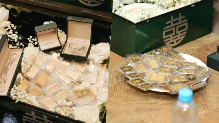 Cận cảnh sính lễ là trang sức kim cương trị giá 2 tỷ đồng và 88 cây vàng mà cặp đôi nhận được