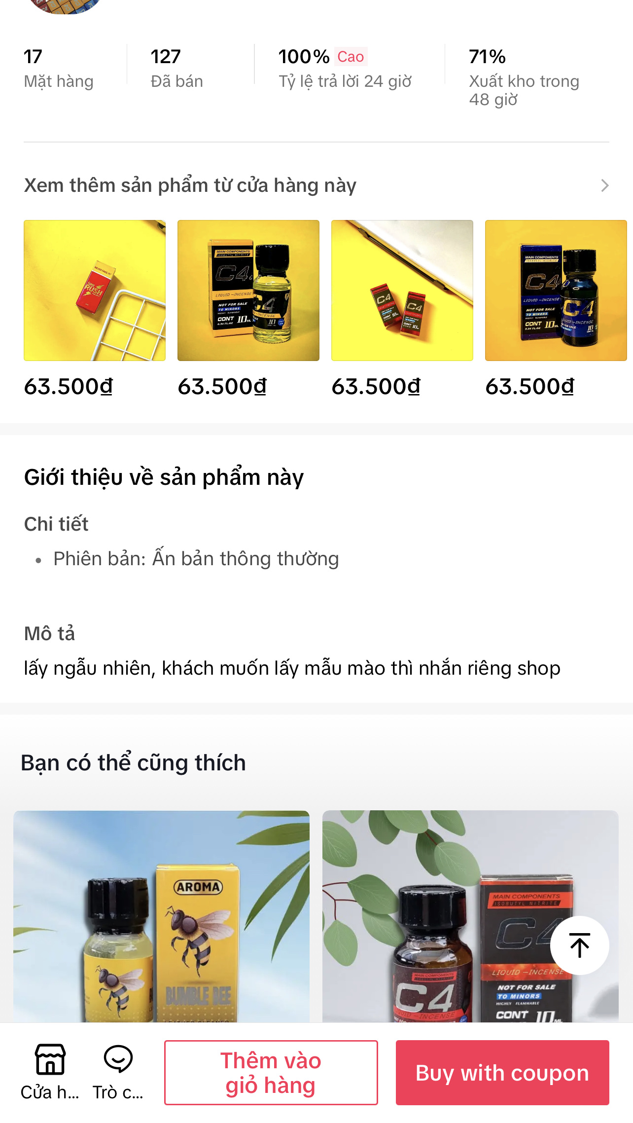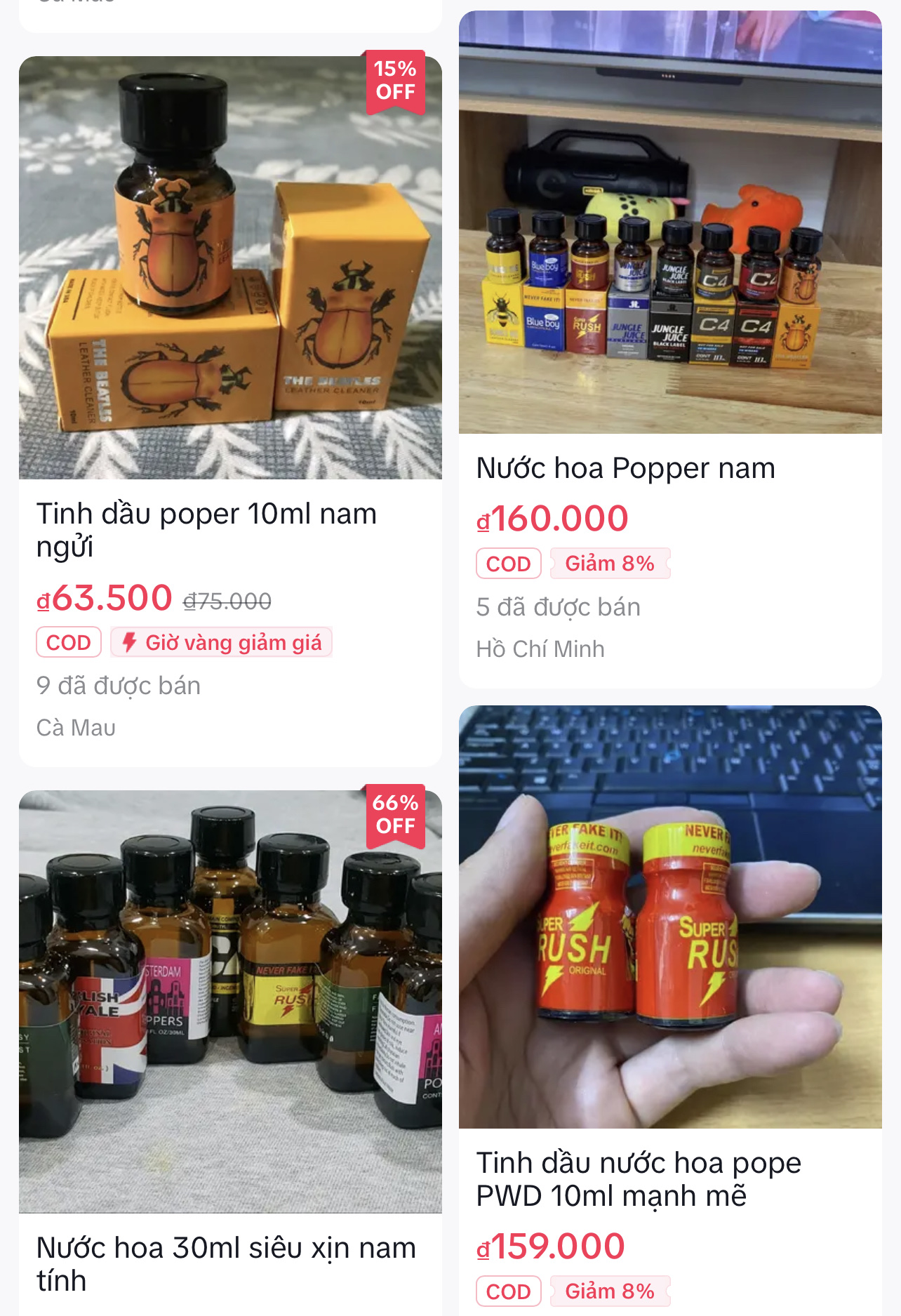 Gõ chữ “Popper” trên công cụ tìm kiếm của TikTok hiện lên hàng chục tài khoản bán sản phẩm cấm quảng cáo này với đa dạng mẫu mã, chủng loại. Tên gọi của mỗi loại sản phẩm được ký hiệu bằng những chữ số ngắn gọn như: C4, Rush, Tom,... Giá popper được bán trên Tiktok cũng rất đa dạng, từ vài chục nghìn đồng đến vài trăm nghìn đồng.