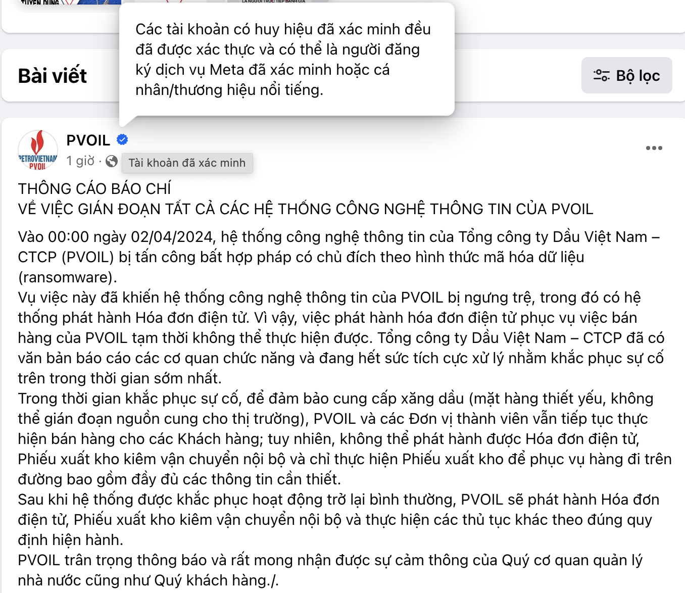 Trang Fanpage của PVOIL (có tick xanh) cho biết, vào 0h0' ngày 2/4/2024, hệ thống công nghệ thông tin của PVOIL bị tấn công bất hợp pháp có chủ đích theo hình thức mã hóa dữ liệu (ransomware).