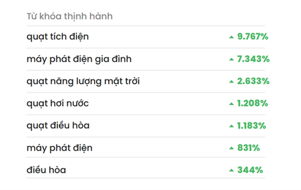 Số liệu từ báo cáo cho thấy, lượng tìm kiếm về các sản phẩm "quạt tích điện, "máy phát điện gia đình" đã gia tăng đột biến, lần lượt đạt mức tăng gấp 97 và 73 lần so với quý 1/2023.