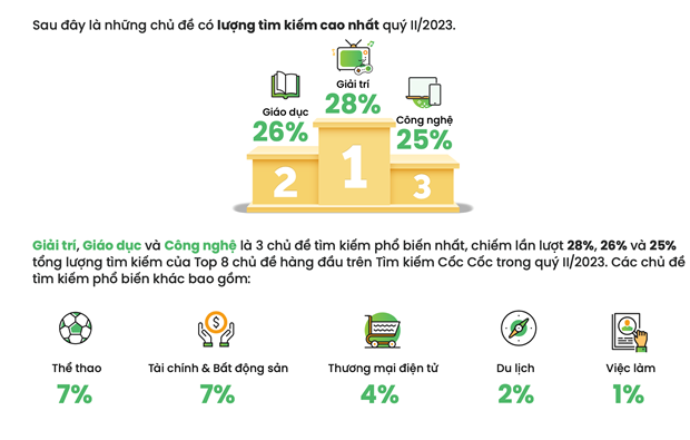 Giải trí giữ vững "ngôi vương" khi tiếp tục là chủ đề tìm kiếm phổ biến nhất quý 2. Chủ đề này chiếm 28% trên Công cụ tìm kiếm Cốc Cốc.