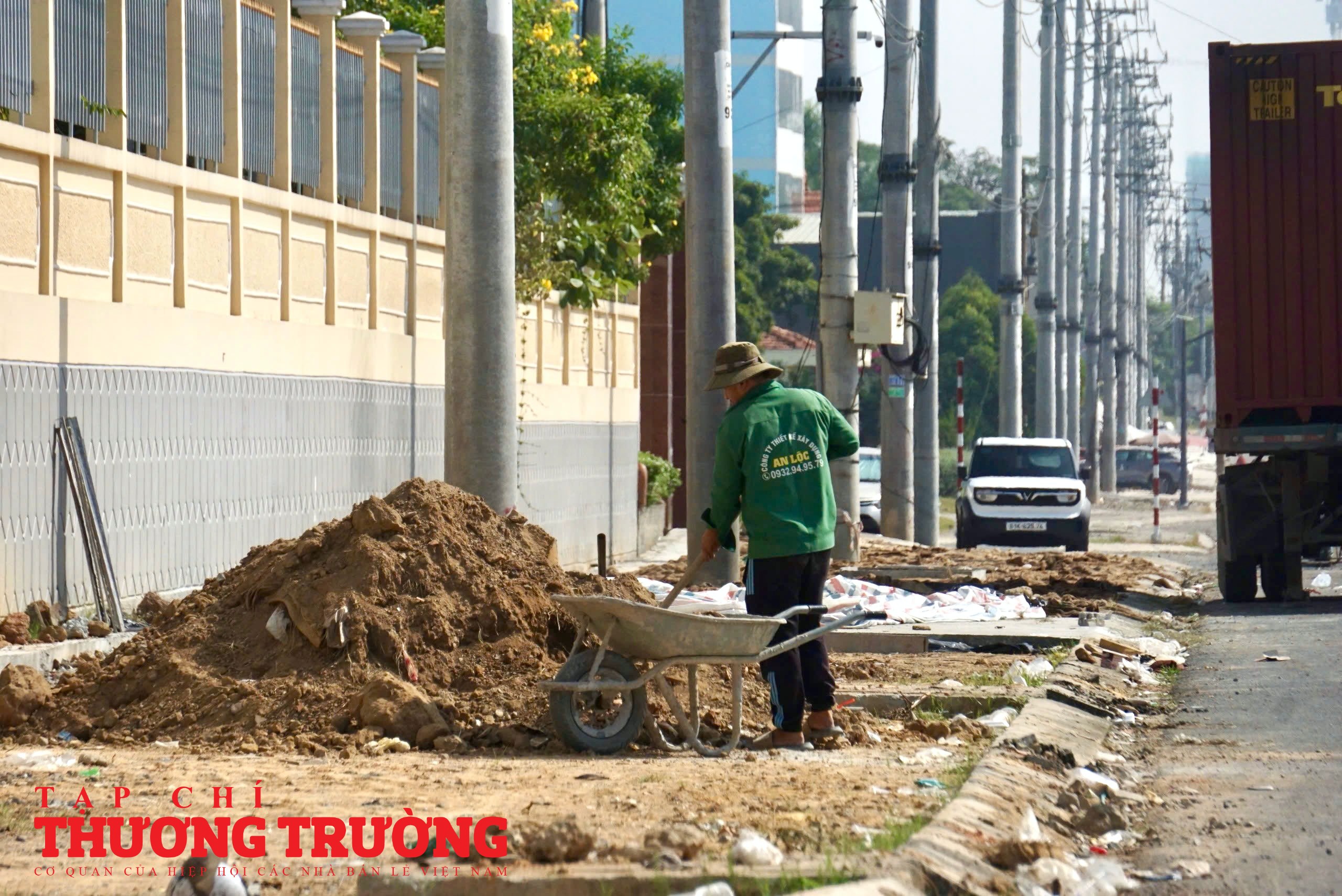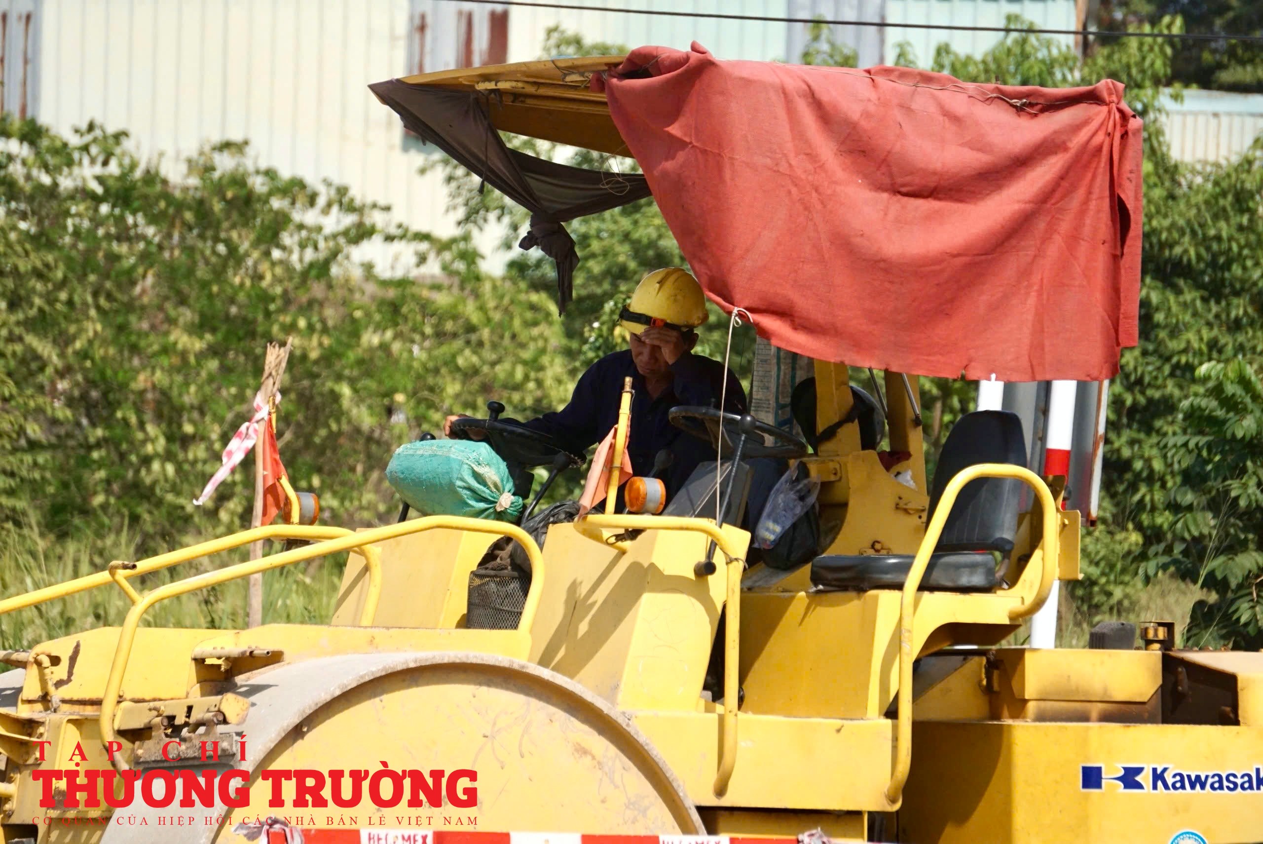 Công nhân đội nắng thi công trên những đoạn vừa hoàn tất giải phóng mặt bằng.
