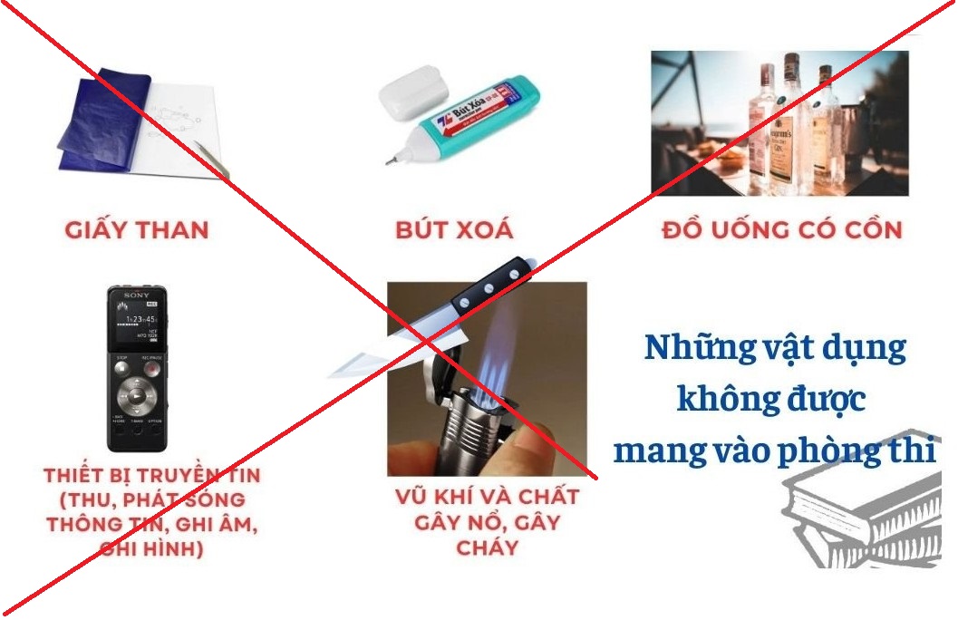(2) Cấm mang vào phòng thi: Giấy than, bút xóa, đồ uống có cồn; vũ khí và chất gây nổ, gây cháy; tài liệu, thiết bị truyền tin hoặc chứa thông tin để gian lận trong quá trình làm bài thi.