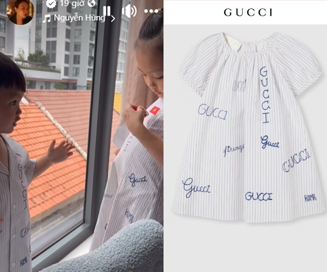 Set đồ đôi của 2 nhóc tỳ thực chất đều đến từ nhà mốt nổi tiếng Gucci với mức giá không hề nhỏ. Trên web hãng, mẫu váy xòe "xinh yêu" của Suchin có giá 22 triệu đồng.