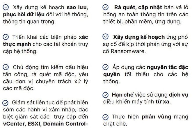 Cẩm nang đã hướng dẫn cụ thể 9 biện pháp phòng chống, giảm thiểu rủi ro từ tấn công ransomware cho các cơ quan, tổ chức và doanh nghiệp, hướng đến mục tiêu chung bảo đảm an toàn không gian mạng quốc gia.