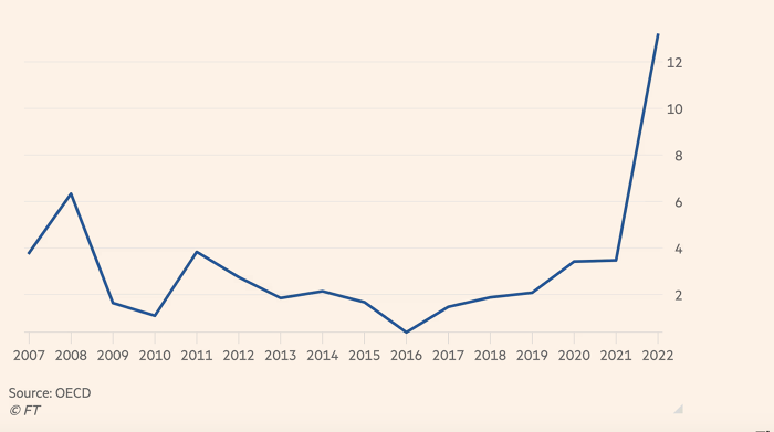 Lạm phát giá lương thực tại các nước trong nhóm OECD (Đơn vị %, Nguồn: OECD, Financial Times).