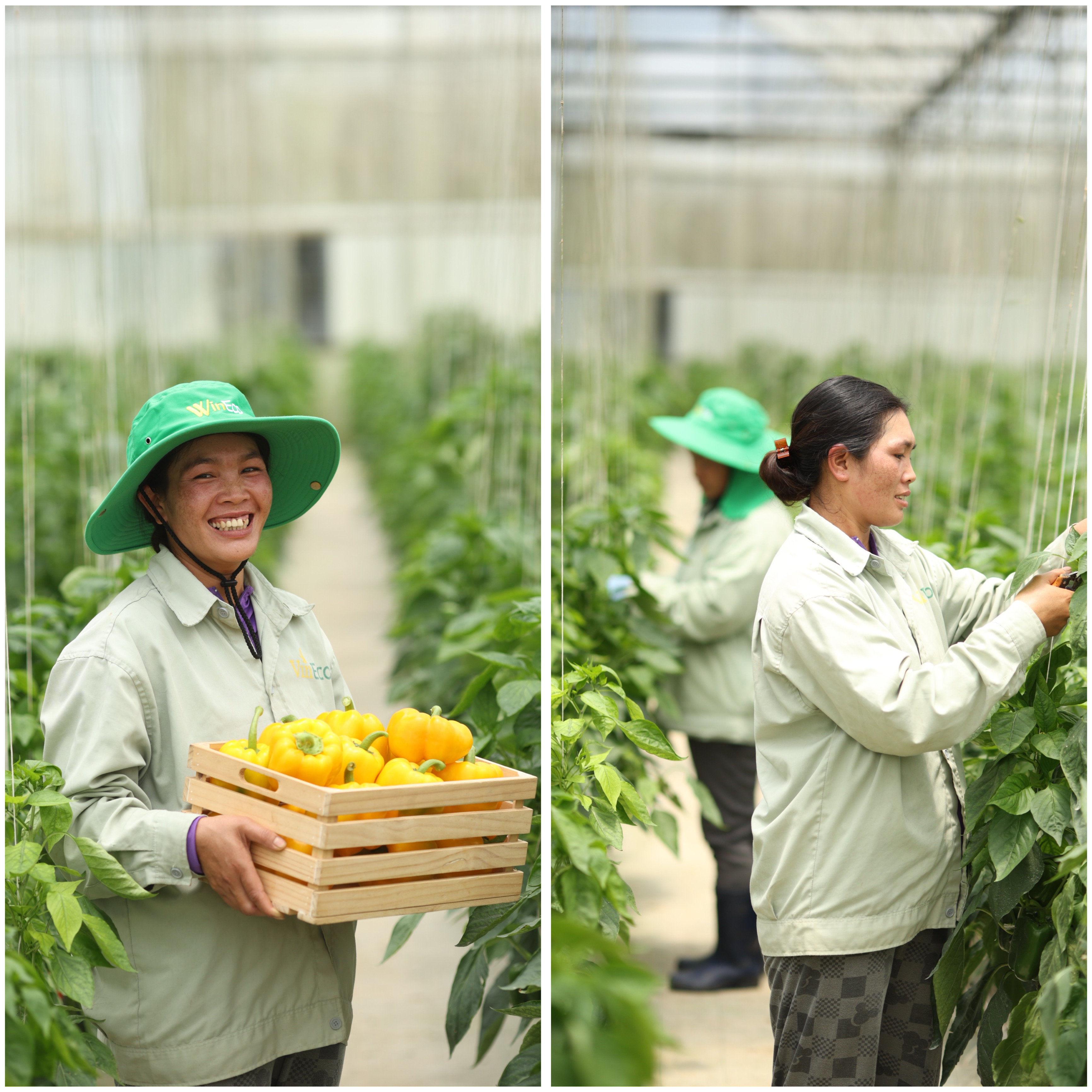 Các cô công nhân làm việc tại nông trường Lạc Dương dù bận rộn với công việc nhưng luôn tươi cười và tận hưởng niềm vui khi vụ mùa bội thu. WinEco đã đem đến cho các cô công nhân nguồn thu nhập và công việc ổn định để duy trì cuộc sống - Ảnh H.Q