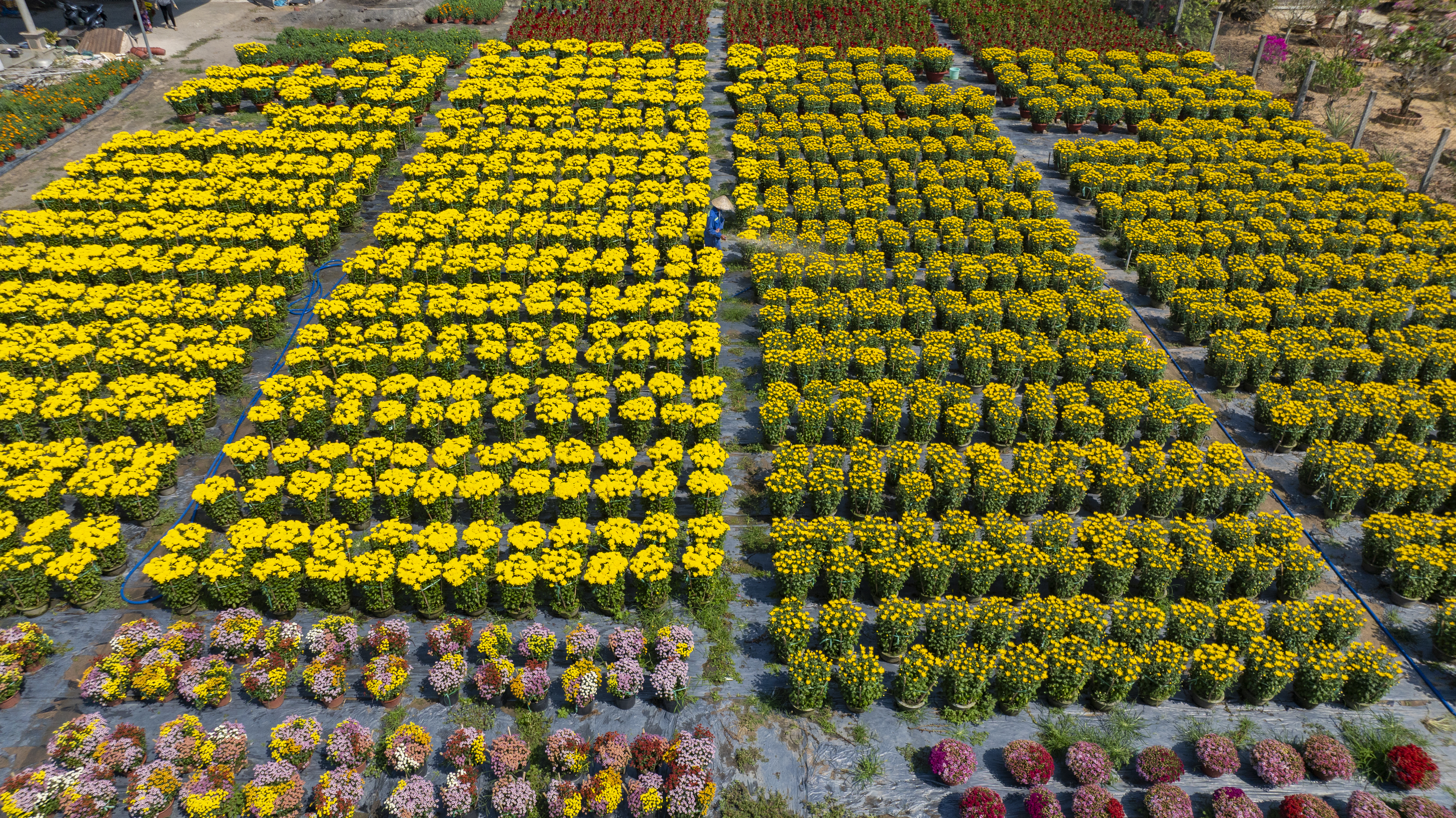 Những luống hoa cúc nhiều màu (vàng, hồng, cam, đỏ) được trồng xen kẽ, tạo nên bức tranh sắc xuân rực rỡ từ trên cao.
