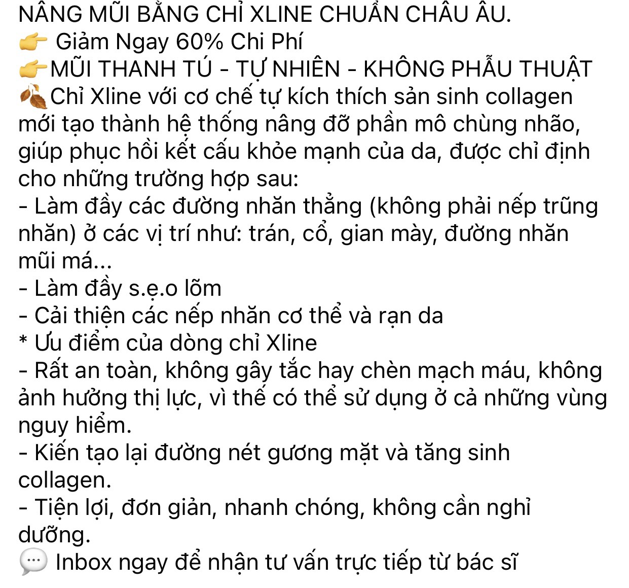 Thế nhưng trên các diễn đàn, mạng xã hội, nâng mũi chỉ được các phòng khám, cơ sở thẩm mỹ, cá nhân đang quảng cáo rầm rộ, đánh vào tâm lý sợ đau, sợ dao kéo, phẫu thuật mà vẫn muốn có được chiếc mũi cao đẹp, hài hòa với không mặt của khách hàng.