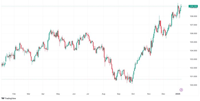 Diễn biến chỉ số DXY từ đầu năm 2024 đến ngày 10/1/2025 (Ảnh: TradingView)