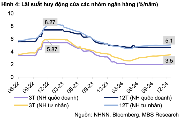 "Dự báo lãi suất huy động kỳ hạn 12 tháng của các ngân hàng lớn sẽ dao động trong khoảng 5% - 5,2% trong năm 2025", báo cáo cho hay.
