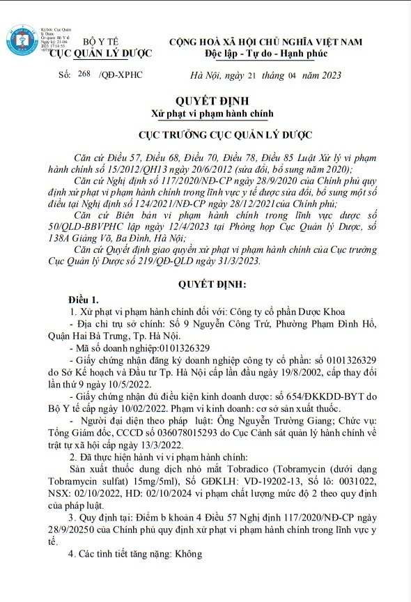 Cụ thể, Công ty Cổ phần Dược Khoa đã thực hiện hành vi vi phạm hành chính do sản xuất thuốc dung dịch nhỏ mắt Tobradico (Tobramycin (dưới dạng Tobramycin sulfat) 15mg/5ml), Số GĐKLH: VD-19202-13, Số lô: 0031022, NSX: 02/10/2022, HD: 02/10/2024 vi phạm chất lượng mức độ 2 theo quy định của pháp luật.