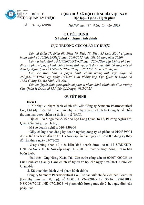 Cụ thể, theo quyết định số 166/QĐ-XPHC của Cục Quản lý dược, Công ty Samnam Pharmaceutical Co., Ltd sản xuất thuốc viên nén Levosum (Levothyroxin natri 0,1mg), Số GĐKLH: VN-22010- 19, Số lô: E27621012, NSX 08/7/2021, HD 07/7/2024 vi phạm chất lượng mức độ 2 theo quy định của pháp luật. Vi phạm quy định tại Điểm b khoản 4 Điều 57 Nghị định 117/2020/NĐ-CP ngày 28/9/20250 của Chính phủ quy định xử phạt vi phạm hành chính trong lĩnh vực y tế.