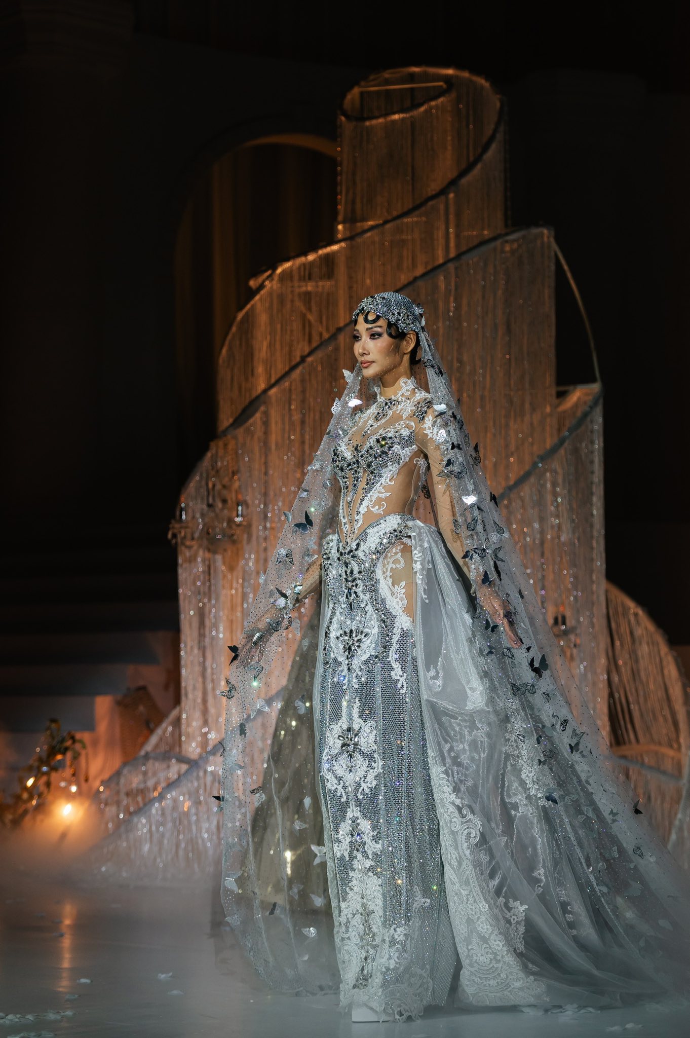 Hoàng Thùy phô diễn thần thái kiêu kì lẫn nhan sắc kiều diễm khi diện đầm cưới xuyên thấu với phần voan dài quét đất.
