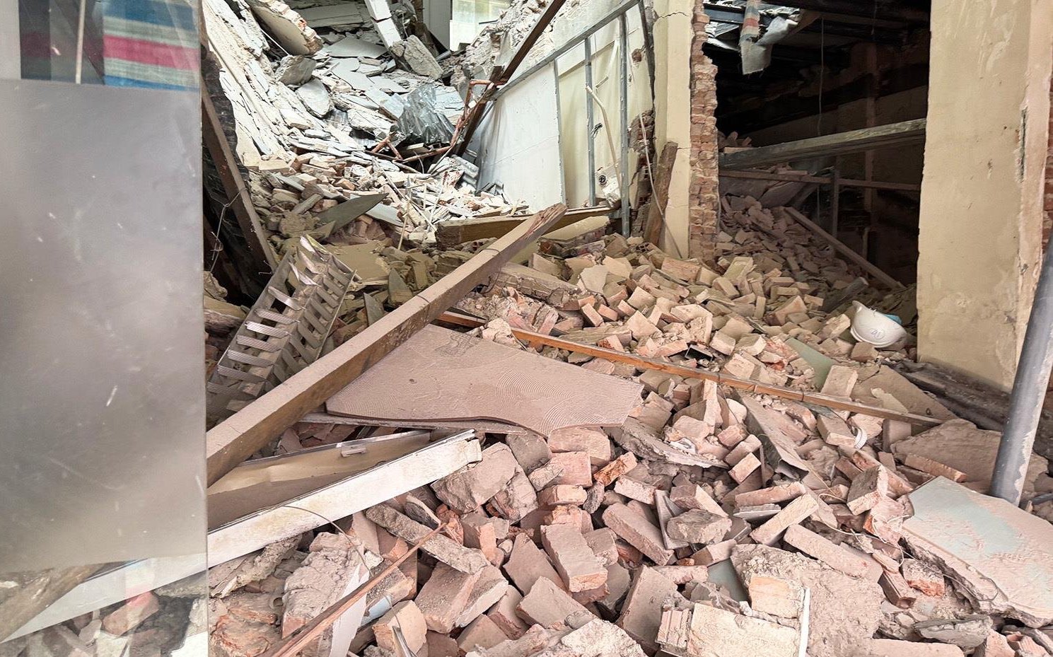Sau sự cố sập sàn toà nhà ở Quận 1, TP.HCM vào trưa nay 27/8, bên trong các thanh sắt thép, gỗ nằm ngổn ngang, gạch, xà bần phủ kín tầng trệt.
